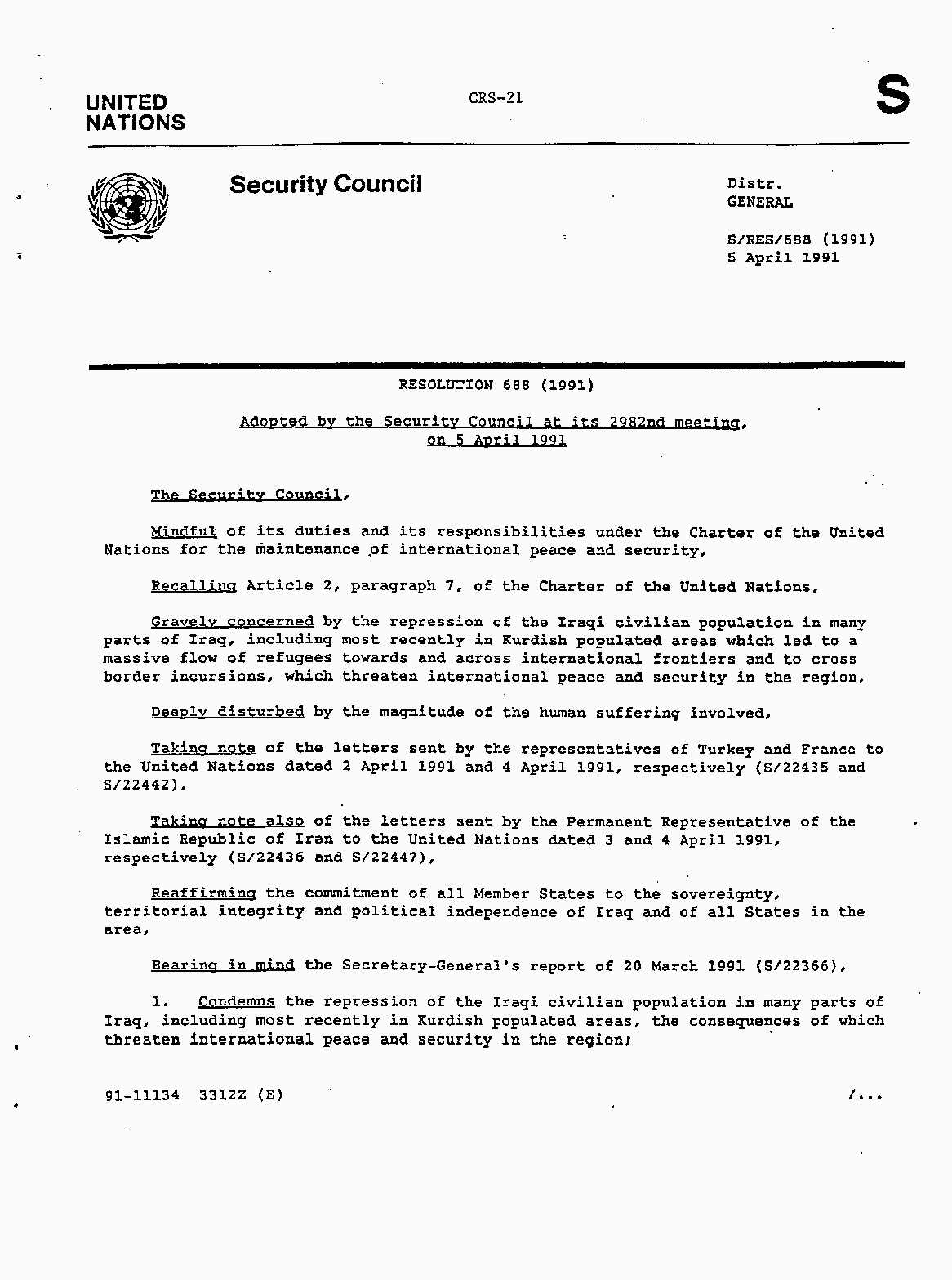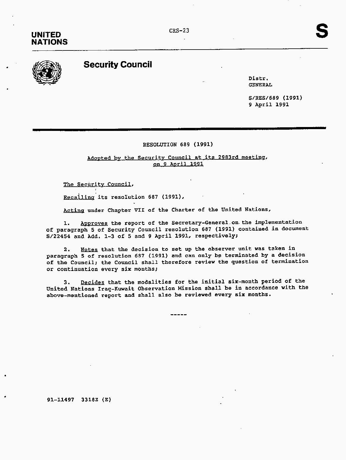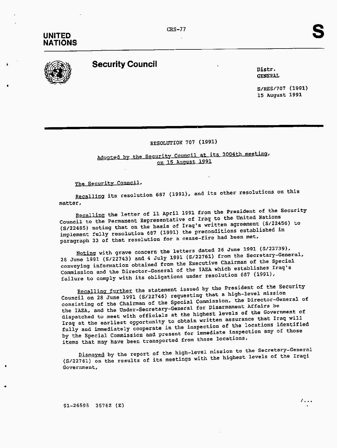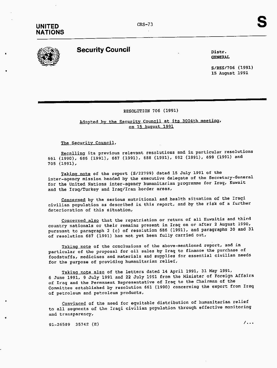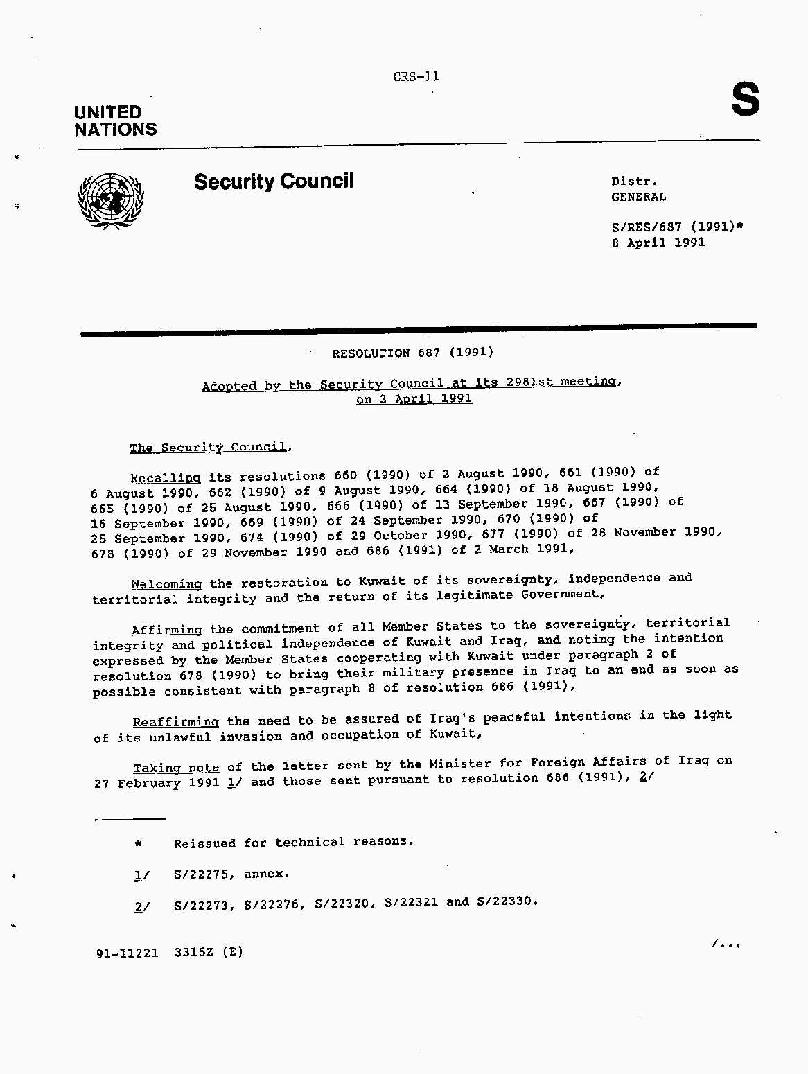 Iraq-Kuwait: United Nations Security Council Resolutions Tests and Votes -- 1991