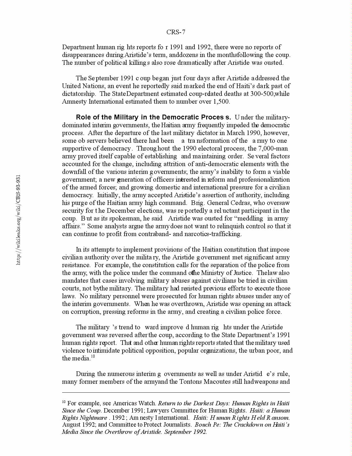 10 For example, see Americas Watch. Return to the Darkest Days: Human Rights in Haiti