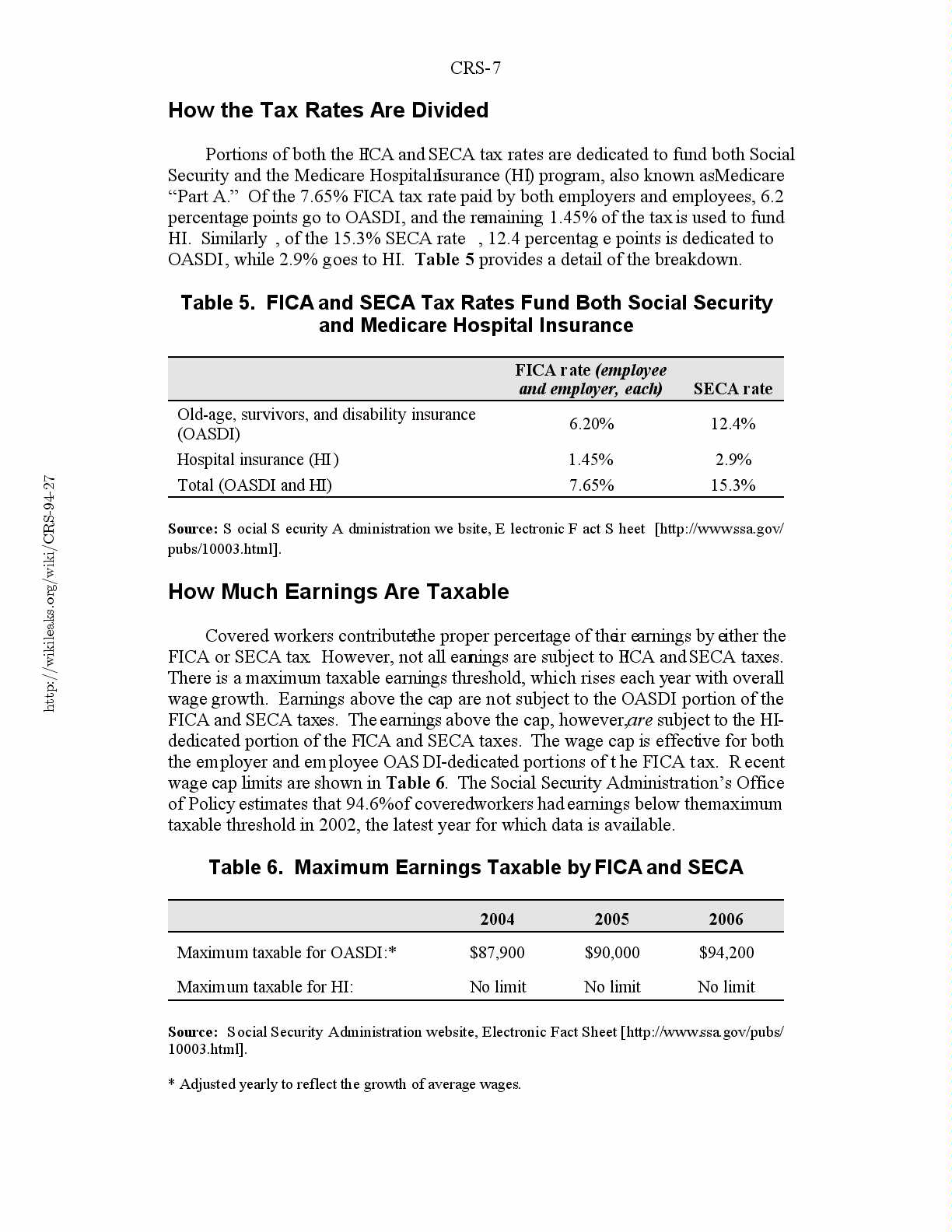 Table 6. Maximum Earnings Taxable by FICA and SECA.................7