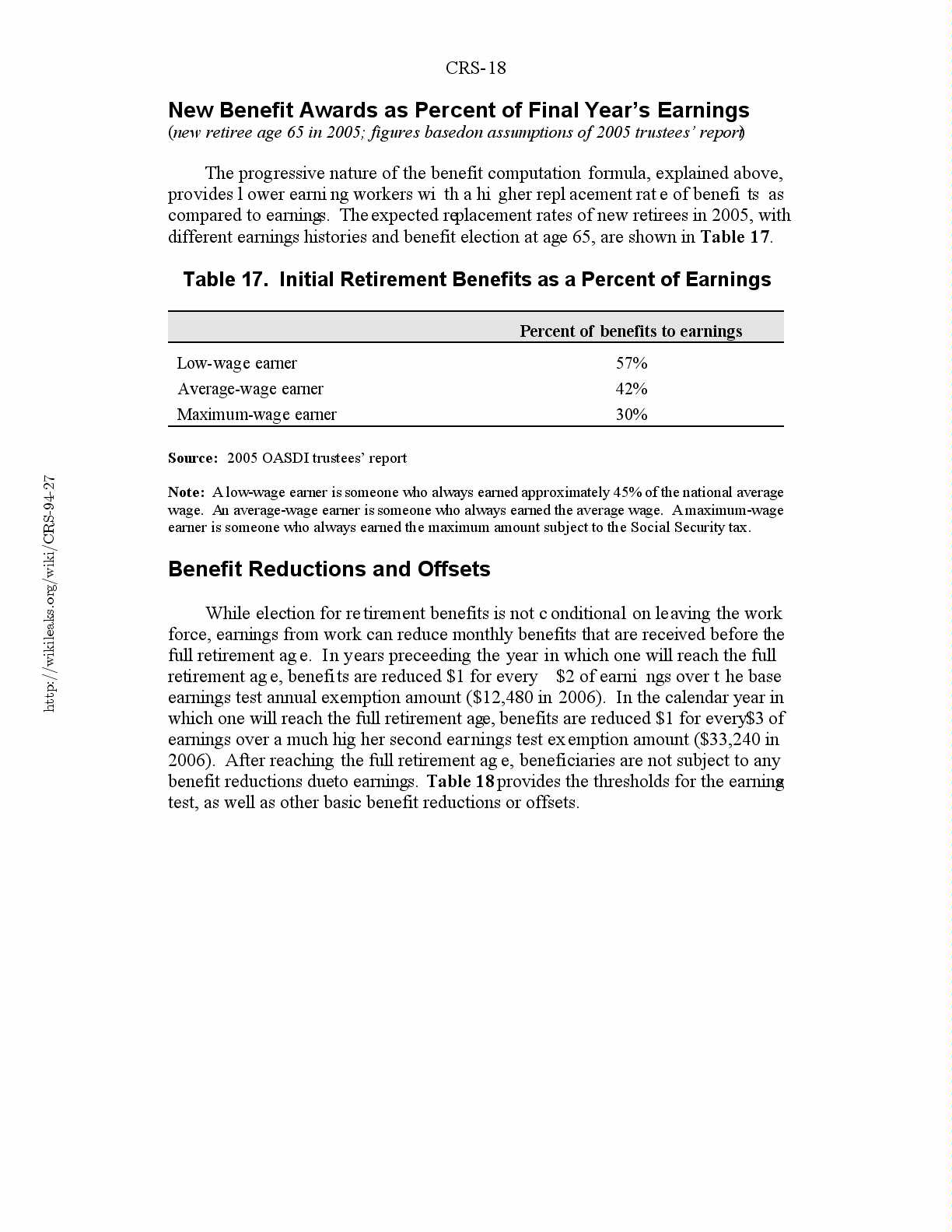 Table 17. Initial Retirement Benefits as a Percent of Earnings.............18