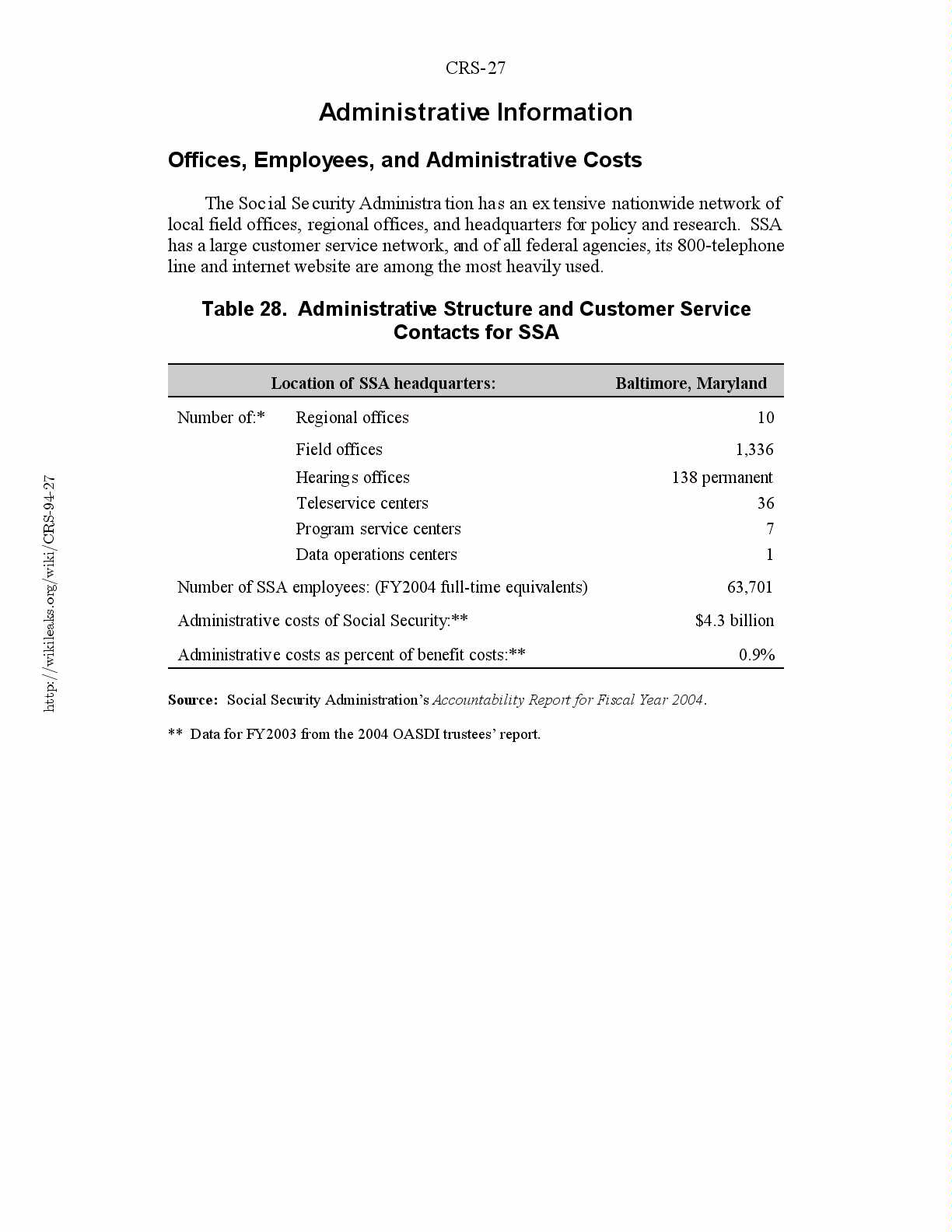 Table 28. Administrative Structure and Customer Service Contacts for SSA..27