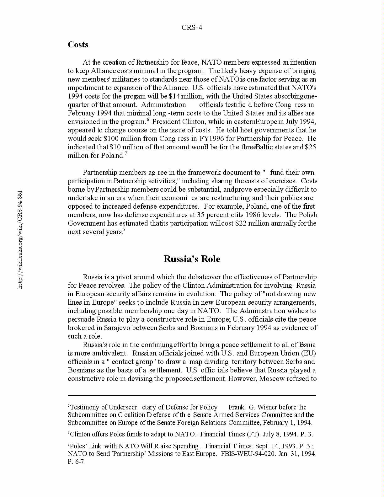 early cost estimates of the program; Russia's envisioned role in PfP; and the Clinton